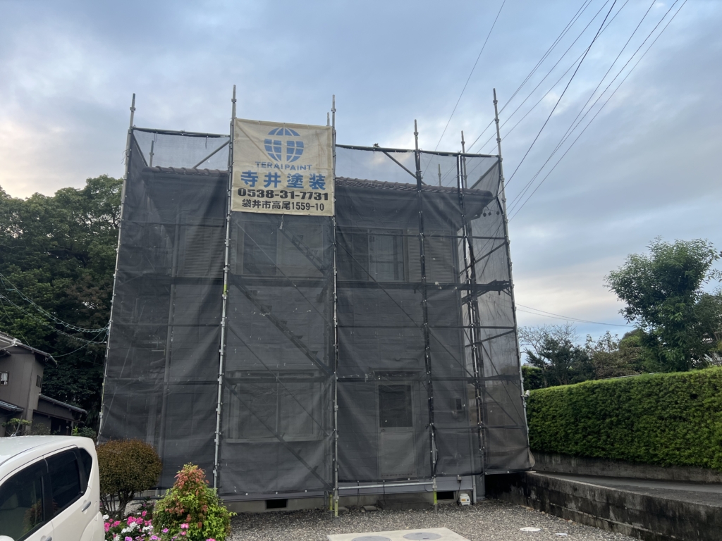 本日足場組立、明日高圧洗浄からスタートします袋井市山崎F様邸になります。高圧洗浄後、シーリング、軒天井、外壁、付帯部、雨戸戸袋、ベランダ床の塗装工事を行います。