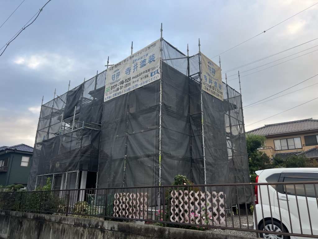 本日足場組立、明日高圧洗浄からスタートします袋井市山崎F様邸になります。高圧洗浄後、シーリング、軒天井、外壁、付帯部、雨戸戸袋、ベランダ床の塗装工事を行います。