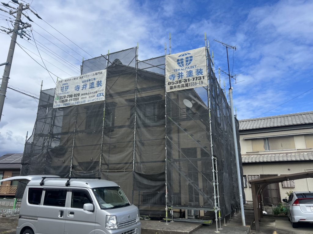 足場組立、高圧洗浄からスタートしました袋井市岡崎W様邸になります。シーリング工事後、外壁、付帯部、雨戸戸袋、ベランダ床の塗装工事を行います。
