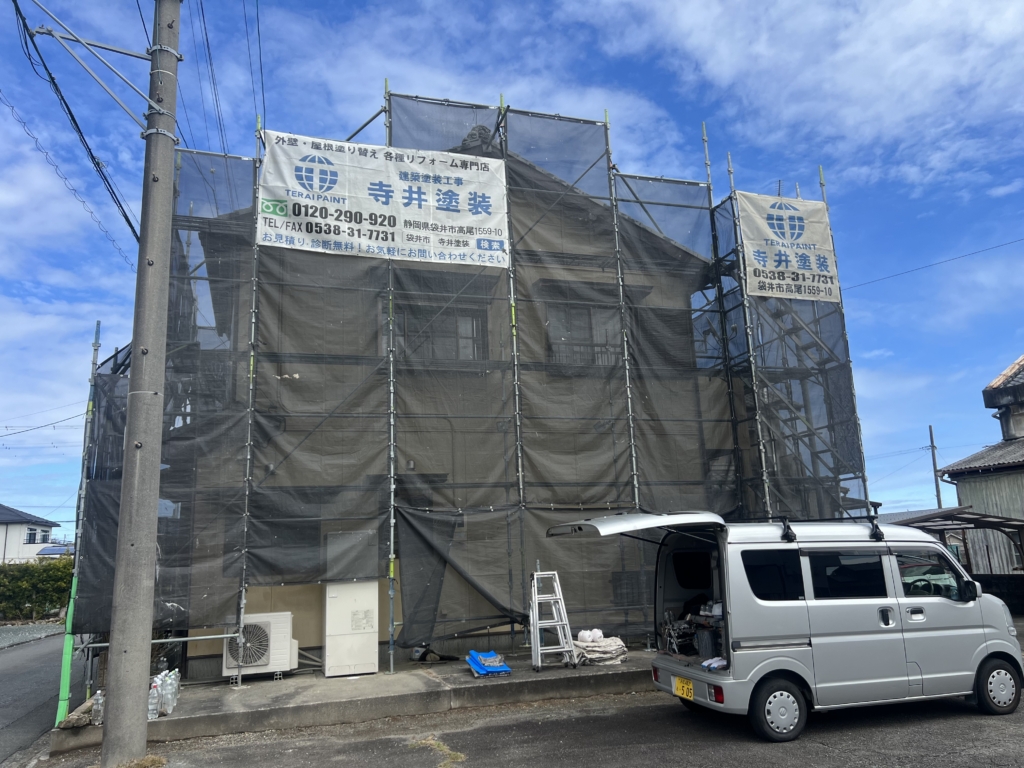 足場組立、高圧洗浄からスタートしました袋井市岡崎W様邸になります。シーリング工事後、外壁、付帯部、雨戸戸袋、ベランダ床の塗装工事を行います。