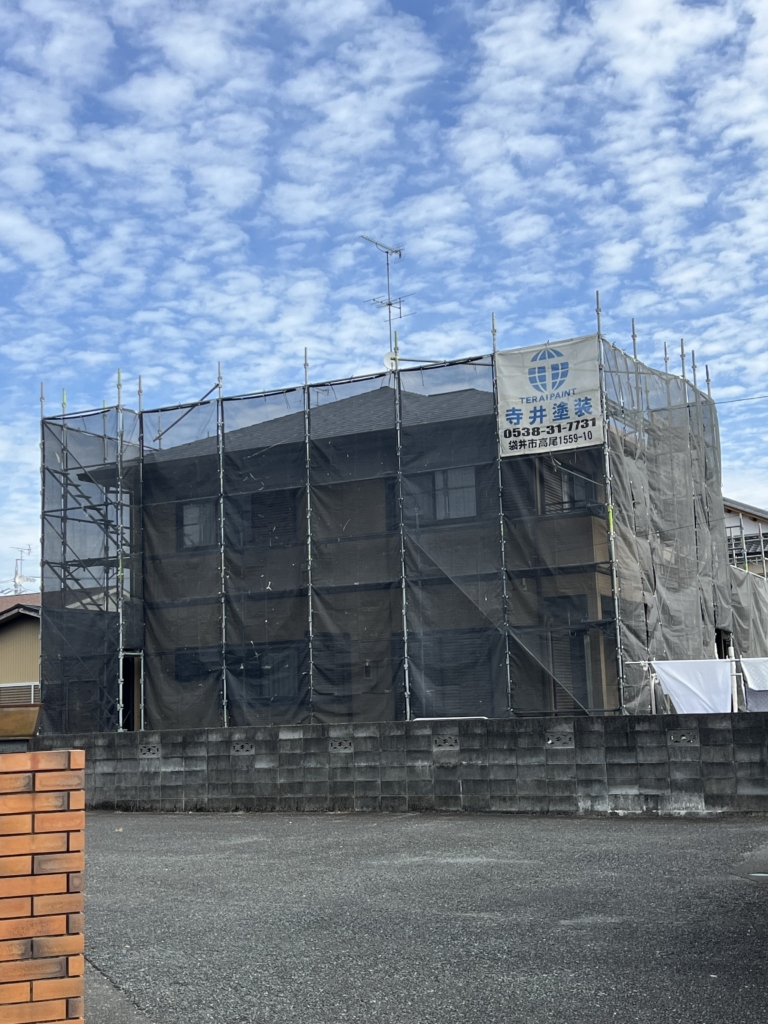 昨日足場組立して高圧洗浄からスタートします袋井市川井I様邸になります。屋根、軒天井、外壁、付帯部、雨戸、ベランダ床の塗装工事を行います。