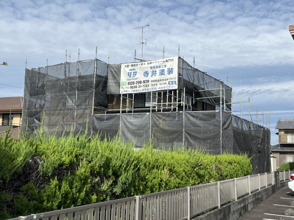 昨日足場組立して高圧洗浄からスタートします袋井市川井I様邸になります。屋根、軒天井、外壁、付帯部、雨戸、ベランダ床の塗装工事を行います。